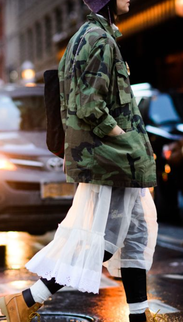 An essential in modern wardrobes, the shirt jacket, also known as the overshirt, sits somewhere between polish and ease. It’s gender-fluid, easy to layer, and endlessly adaptable: over dresses, under coats, tucked into trousers. Designers keep playing with proportion, testing how big the collar can get or how low the shoulder can drop. The look feels distinct but familiar. My favorite fits mix new and old—flowy dresses with camo or a utility vest over a crisp shirt jacket. It softens the seriousness of military surplus and keeps the style fresh, real, and a little imperfect.
